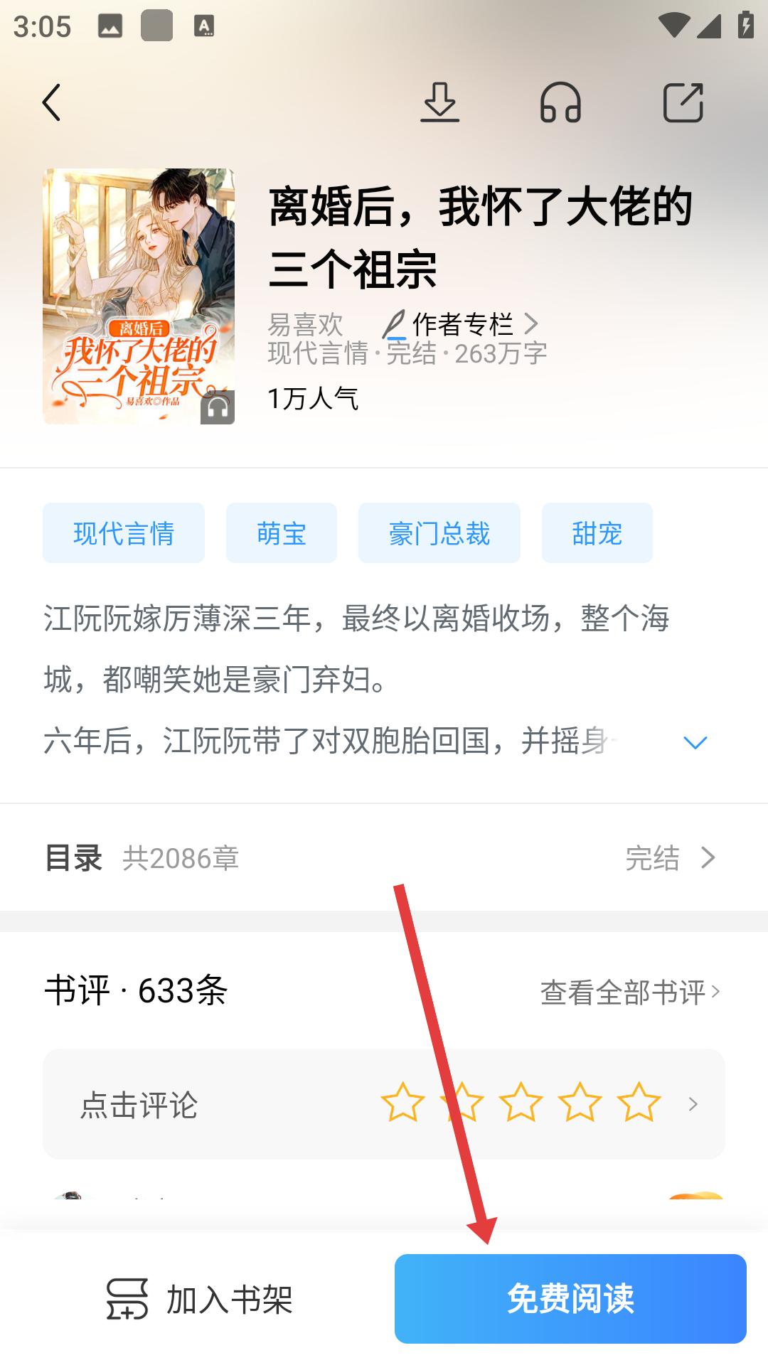 3、在小說詳情頁,用戶可查看簡介、書評等信息后,點擊免費閱讀,開始閱讀小說內容。