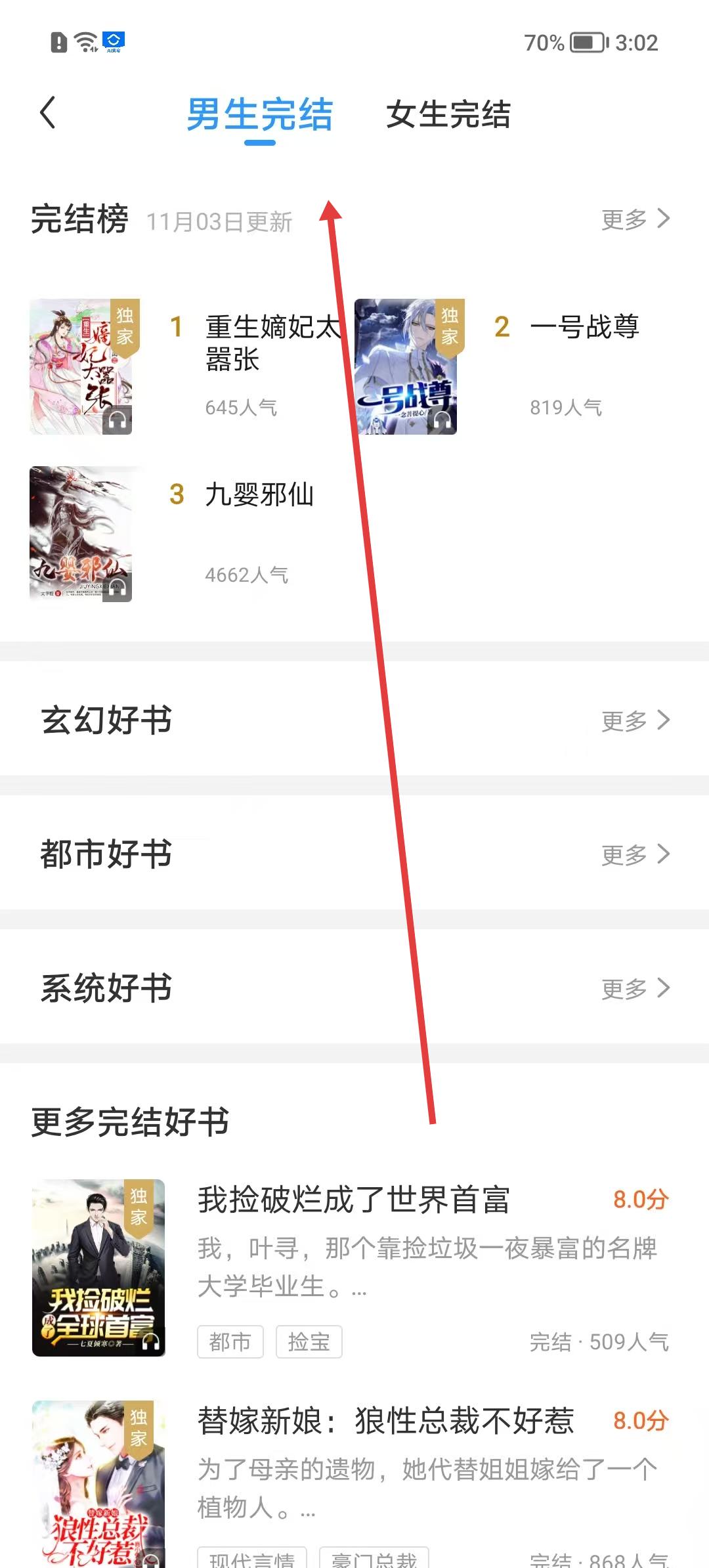 4、進入男生完結頁面查看完結榜和各類完結好書,如重生嫡妃太囂張、我撿破爛成了世界首富等,選擇小說進行閱讀。
