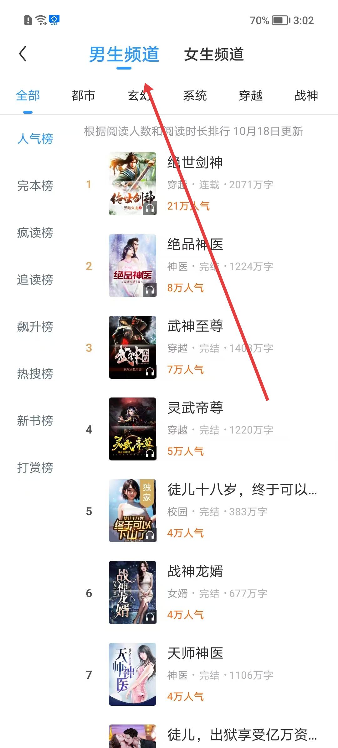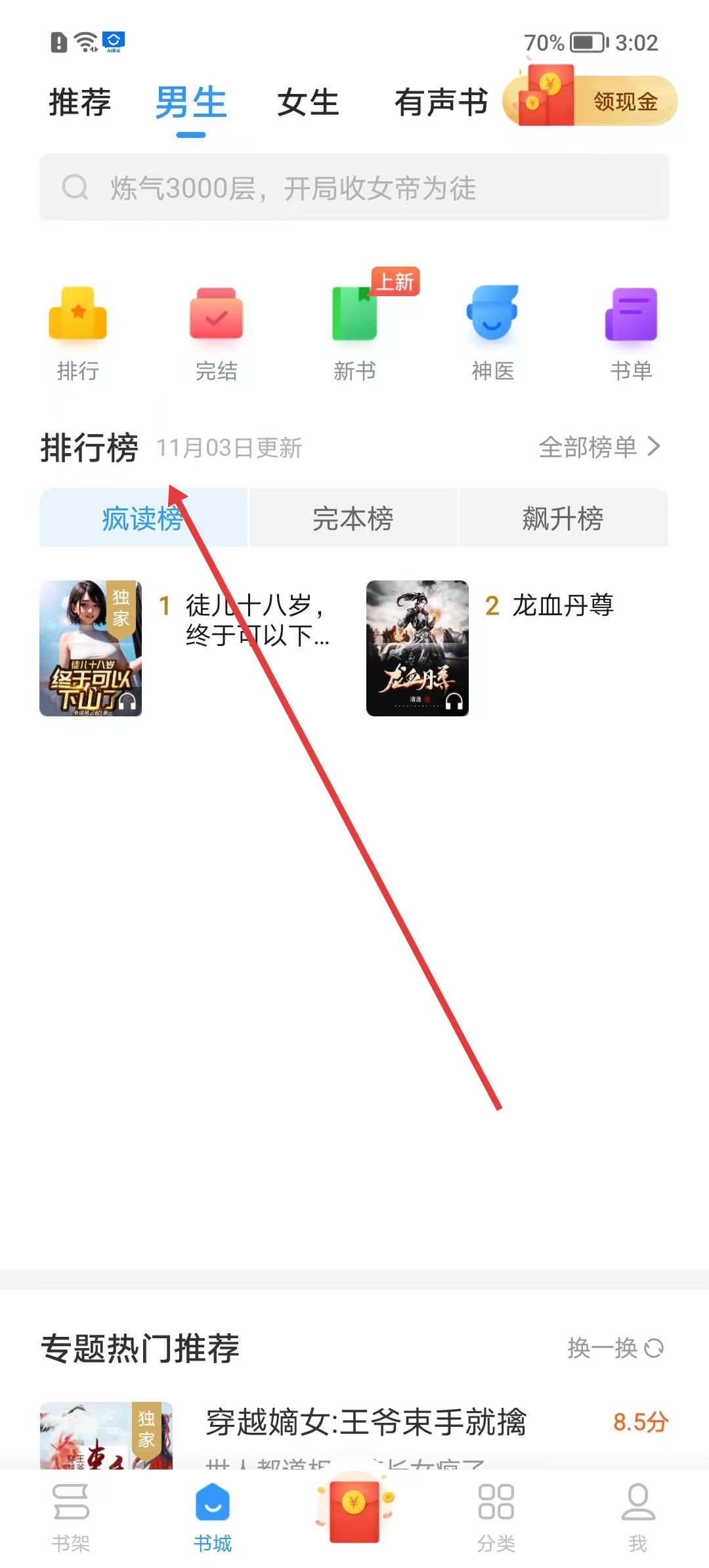 2、進入書城頁面選擇男生分類,查看排行榜,了解徒兒十八歲,終于可以下山等熱門小說的人氣情況。