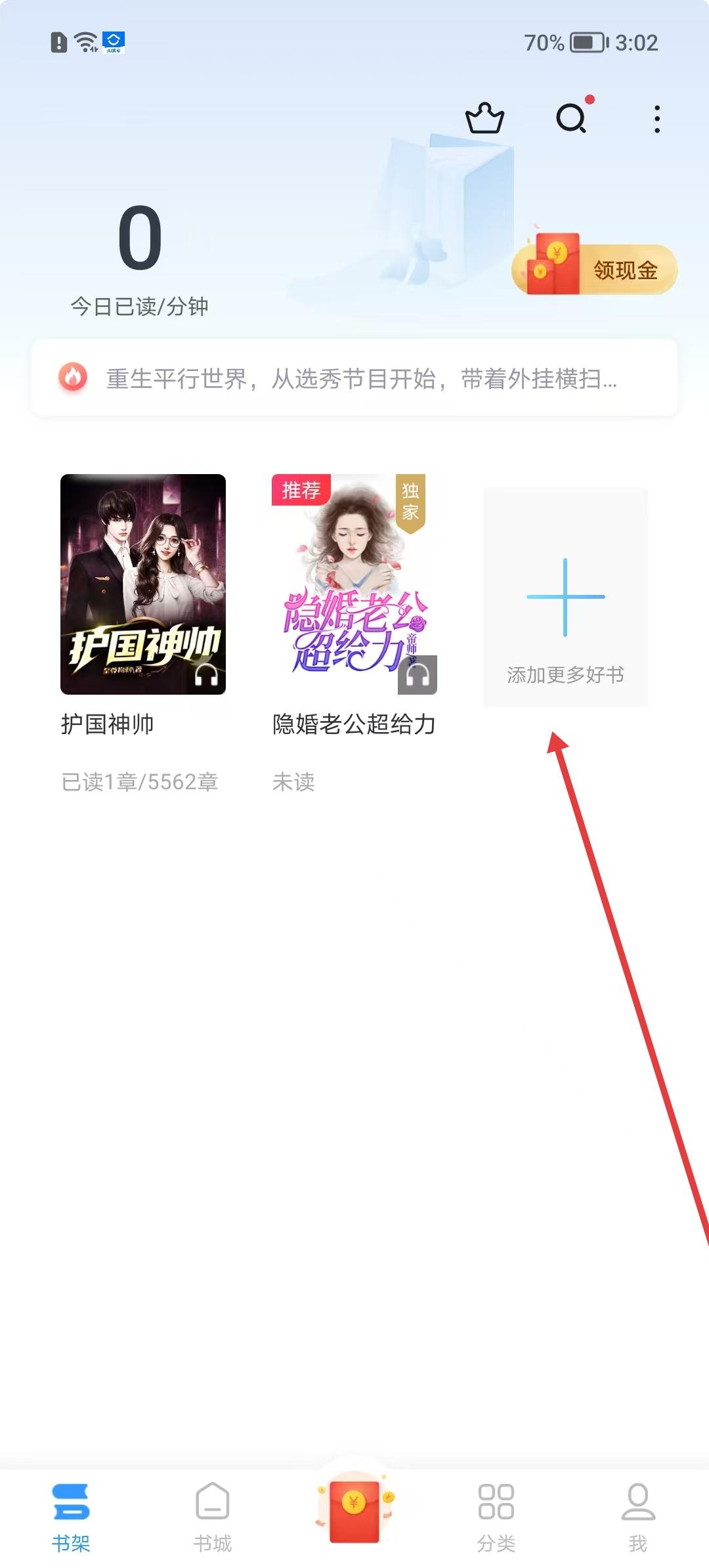 1、進入軟件書架頁面,點擊添加更多好書,可添加心儀小說到書架,管理個人閱讀書籍。
