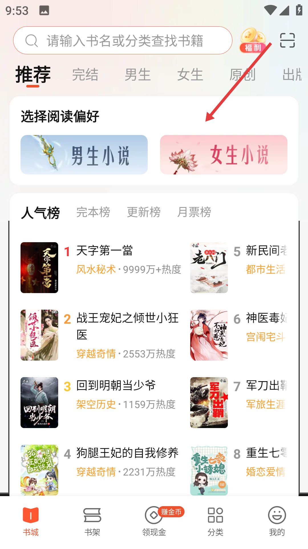 1、在書城界面可選擇閱讀偏好為男生或女生小說,還有人氣榜等榜單,方便用戶找到熱門書籍,滿足不同閱讀喜好。