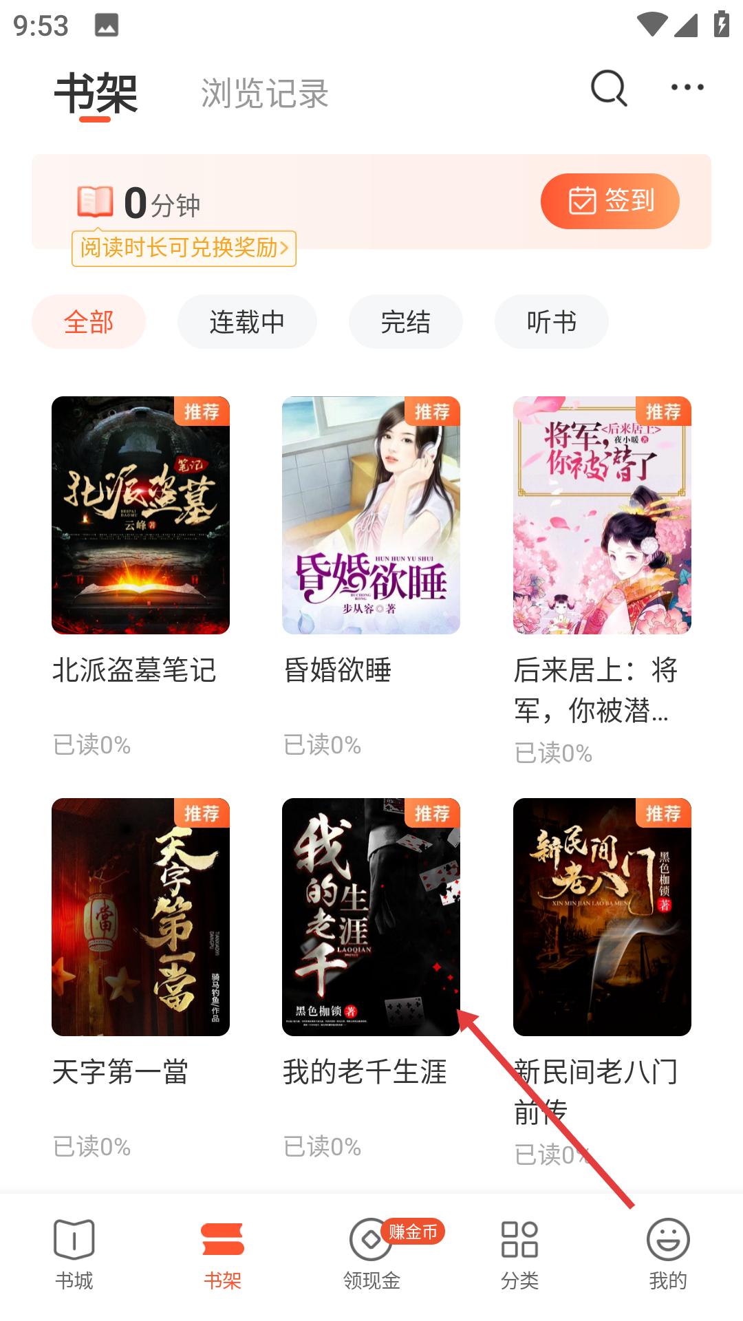 2、書架里能看到自己添加的書籍,還能查看閱讀時長,簽到可兌換獎勵,方便管理閱讀內容。