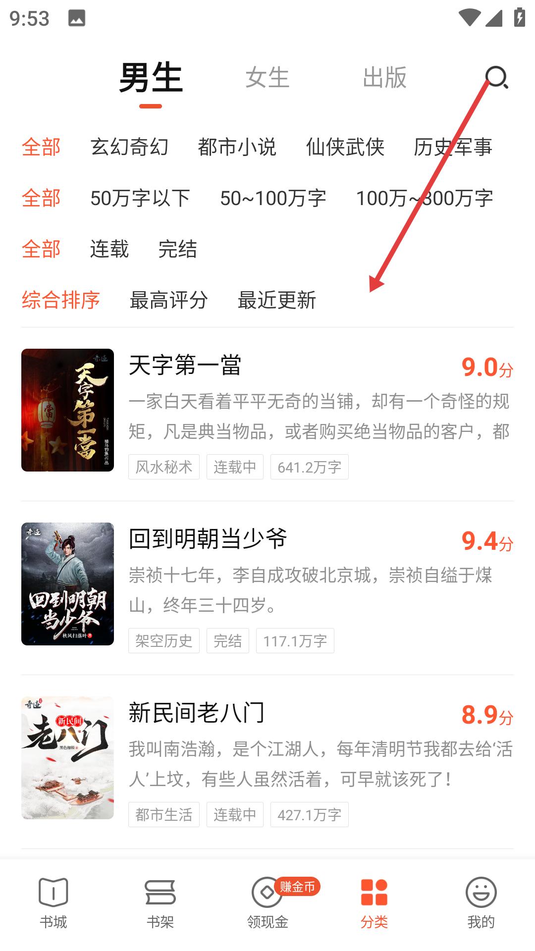 3、在分類的男生小說板塊能按類型、字數、狀態等篩選,還有不同排序方式,幫助用戶精準找到想看的小說。