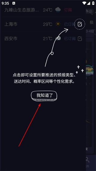 2、在城市天氣頁面查看已訂閱城市的天氣信息,點擊提示彈窗的我知道了,可設置預報推送的類型時間頻率等個性化需求。