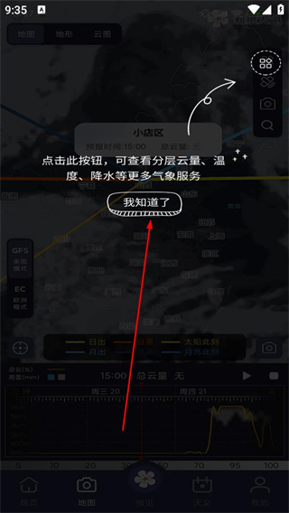 1、打開莉景天氣軟件,查看小區氣象提示彈窗,點擊我知道了關閉提示,可通過對應按鈕查看分層云量溫度降水等氣象服務。