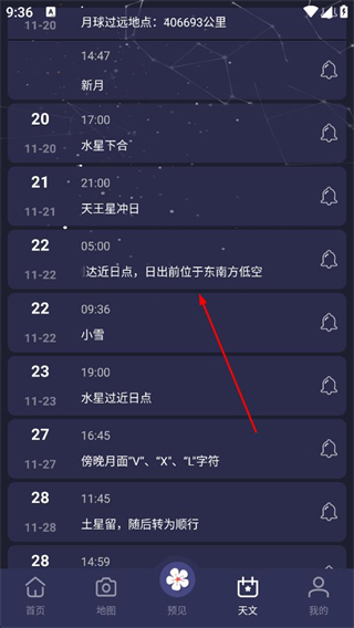 4、切換至天文板塊瀏覽近期天文現象安排,查看不同日期的天象事件,比如水星下合小雪等,了解天文動態信息。