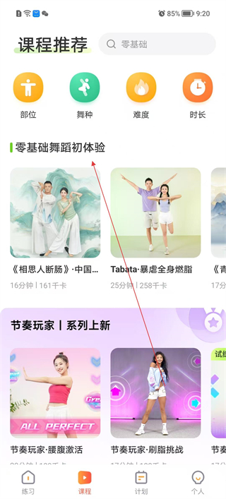 2、切換至課程頁面,瀏覽課程推薦板塊,可按部位舞種等分類篩選,選擇零基礎舞蹈初體驗類課程查看詳情。