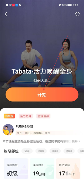3、進入Tabata活力喚醒全身課程頁面,查看課程參與人數教練信息等內容,點擊開始按鈕啟動該課程訓練。