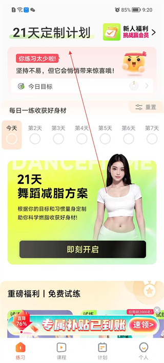 1、打開軟件進入計劃頁面,查看21天定制計劃的今日目標,點擊即刻開啟按鈕,啟動舞蹈減脂方案的訓練安排。