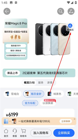 2、在榮耀Magic8Pro手機詳情頁,可查看手機顏色、價格和以舊換新服務,點擊直播間可進入直播頁面。