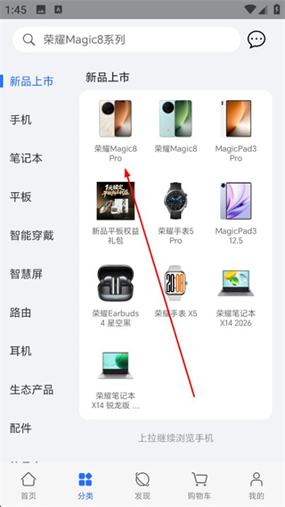 1、進入榮耀商城APP分類頁面,可查看新品上市的手機、平板等產品,選擇榮耀Magic8Pro手機點擊進入詳情頁。