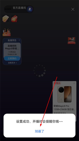 3、在直播間可預約直播設置成功后開播時會提醒,點擊知道了可關閉提示框。