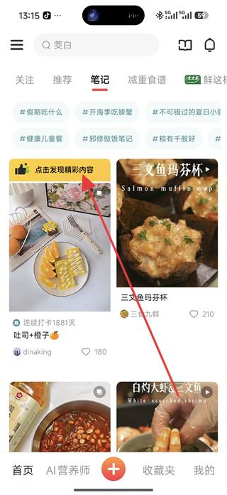 1、進入筆記板塊,可瀏覽各類美食筆記,如吐司加橙子的美食分享,點擊進入筆記詳情頁面,查看美食的圖文內容。