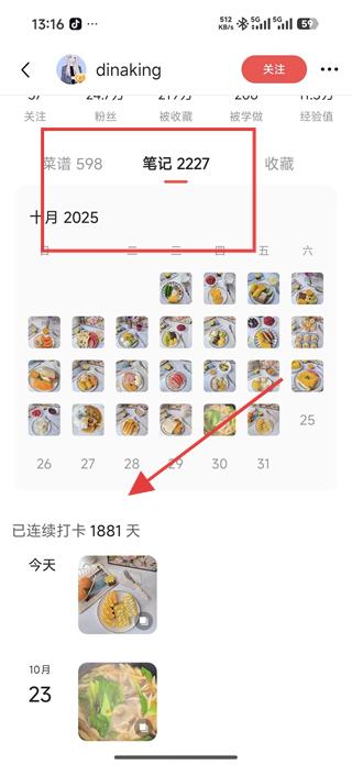 4、在用戶筆記板塊可查看用戶的連續打卡記錄,如已連續打卡1881天,了解用戶的美食分享歷程,也可瀏覽用戶不同日期的筆記內容,獲取更多美食靈感。