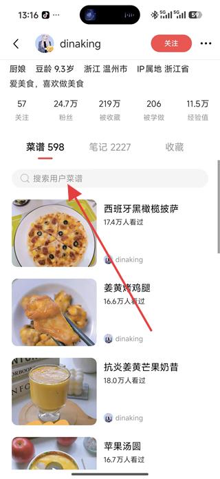 3、進入用戶個人主頁可查看用戶的菜譜和筆記數量,如598個菜譜、2227篇筆記,使用搜索功能查找用戶的特定菜譜,瀏覽感興趣的美食內容。