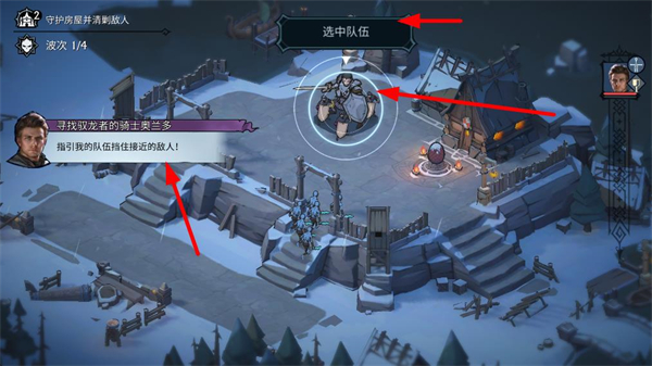 1、選中尋找龍者的騎士奧蘭多等隊伍,指引隊伍前往附近的敵人,守護房屋并清剿敵人,開啟冒險戰斗。