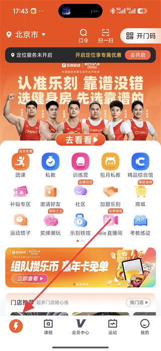 4、在首頁可查看團課、私教、訓練營等功能入口,點擊相應入口可進入查看詳情,還可點擊運動按鈕查看運動記錄,掌握身體數據。