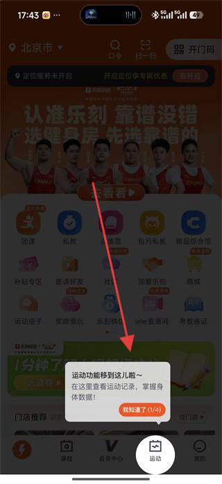 1、打開樂刻運動軟件,若彈出運動功能移到這兒啦的提示,點擊我知道了按鈕,了解運動功能位置。
