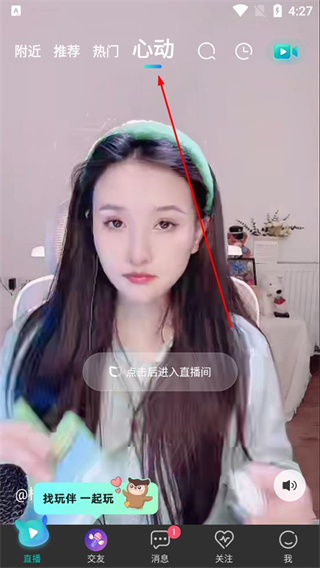 1、進入直播頁面,切換到心動分類,查看當前直播內容,點擊點擊后進入直播間按鈕,進入對應的主播直播間。