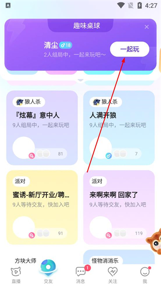 2、切換到交友頁面,瀏覽趣味桌球等游戲房間,選擇清塵的2人組局房間,點擊一起玩按鈕,申請加入該游戲局。