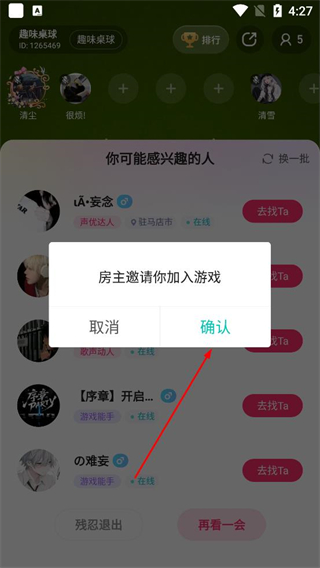 3、收到房主邀請加入游戲的彈窗后,點擊確認按鈕,進入趣味桌球游戲房間,準備參與游戲互動。