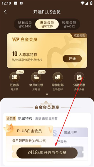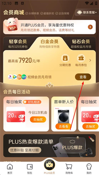 3、登錄后進入PLUS會員頁面,可查看輕享會員、白金會員、鉆石會員的權益,點擊查看可了解更多會員優惠特權。