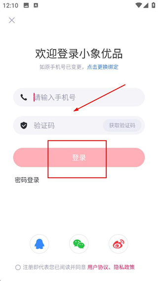 2、在登錄頁面輸入手機號碼,獲取并輸入驗證碼,閱讀并同意用戶協議和隱私政策后點擊登錄,也可選擇密碼登錄或第三方賬號登錄。