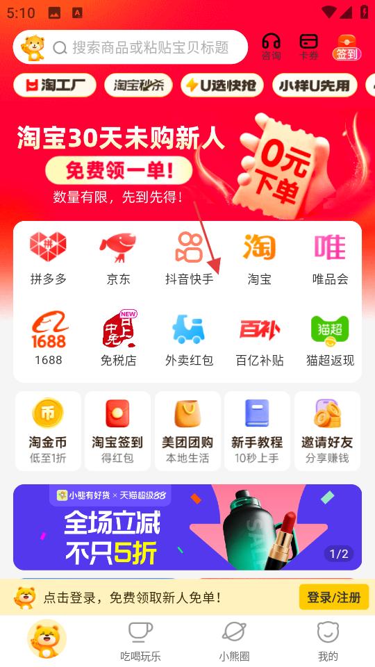 1、進入APP首頁,點擊抖音快手等平臺入口,跳轉瀏覽內容,也可參與淘寶新人活動,免費領取商品,開啟消費體驗。