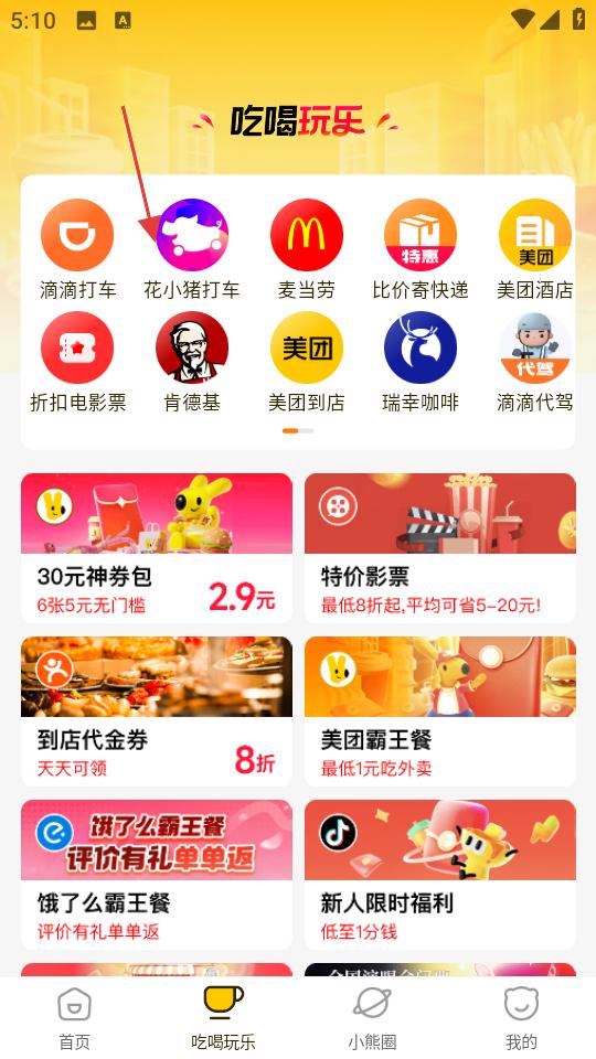2、切換至吃喝玩樂頁面,選擇花小豬打車等服務,查看優惠活動,按需下單用車、餐飲、電影票等,滿足生活需求。