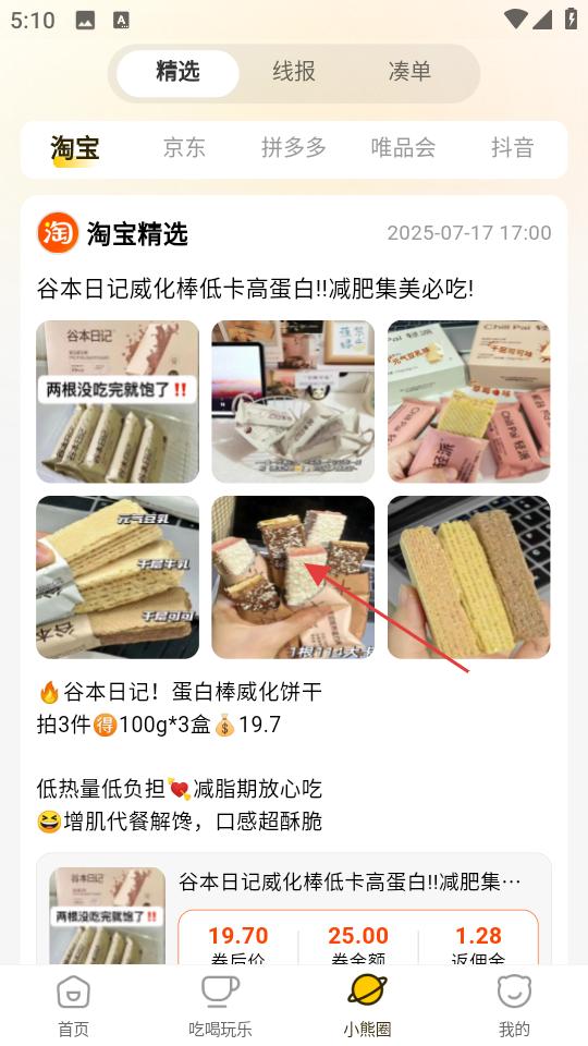 3、進入小熊圈精選頁面,瀏覽淘寶等平臺商品推薦,查看谷本日記威化棒等商品詳情、優惠信息,下單選購心儀好物。