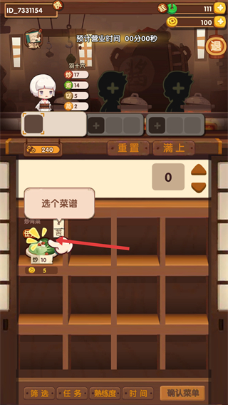 3、選好廚師后,點擊選個菜譜,可選擇炒10等菜譜,確定餐廳要制作的菜品。