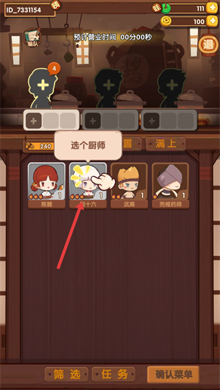 2、在餐廳的經營界面,點擊選個廚師,可從藍藍、碗十六、武靈、克蕾芬特中選擇廚師,為經營餐廳配備人員。