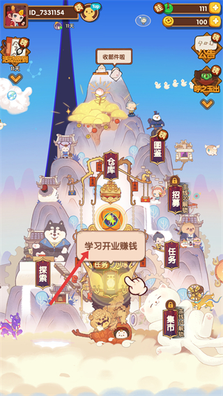 1、可看到倉庫、圖鑒、招募、任務等功能入口,點擊學習開業賺錢,開啟經營餐廳的流程。