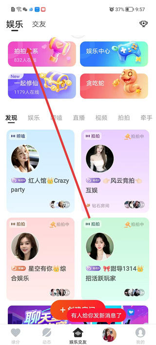 3、進入娛樂交友頁面選擇娛樂分類,查看拍拍家一起修仙等互動玩法,也可瀏覽頻道列表,選擇感興趣的頻道加入互動。