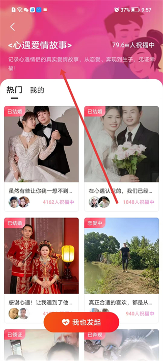 4、點擊熱門話題中的心動愛情故事,進入話題詳情頁,查看其他用戶分享的愛情故事,點擊我也發起按鈕,發布自己的相關內容。