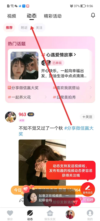 1、打開心遇軟件,進入動態頁面,切換至附近標簽,瀏覽周邊用戶分享的動態內容,查看熱門話題及用戶發布的生活分享。