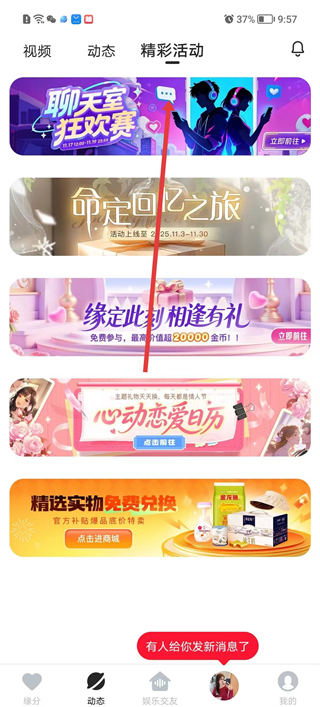 2、切換至精彩活動頁面瀏覽平臺推出的各類活動,比如聊天室狂歡賽命定回憶之旅等,了解活動時間及參與規則。