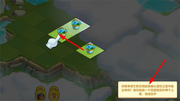 1、需拖放花籃到另外兩個上面完成合并,以此幫忙把文明的英雄從遺忘之霧里救出來,開啟探險。