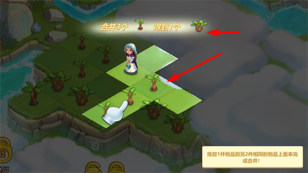 3、拖放1件物品到另2件相同的物品上面完成合并,如合并3個小樹得到1個大樹,通過合并獲取新物品。
