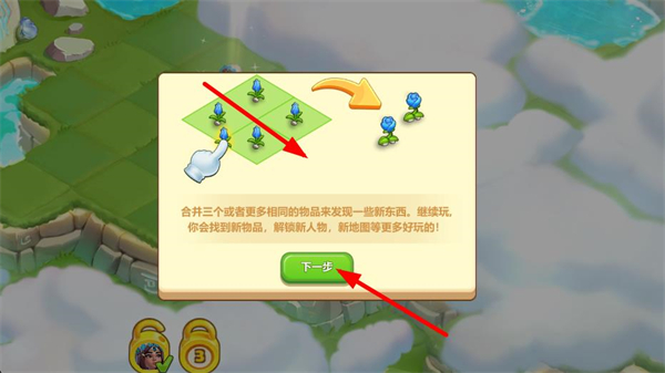 2、合并三個或更多相同的物品可發現新東西,繼續玩能找到新物品、解鎖新人物和新地圖,點擊下一步推進游戲。