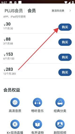 4、進入會員購買頁面可看到PLUS會員的不同時長及價格,有1個月30元、3個月88元等多種選擇,點擊對應時長后的購買按鈕即可。