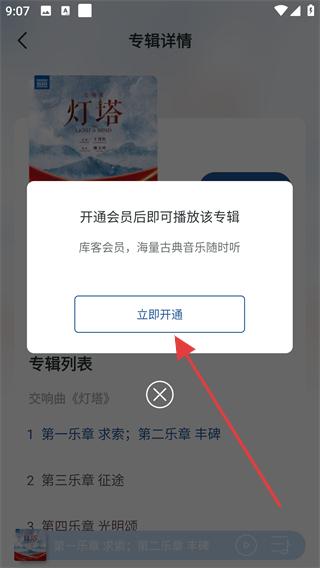 2、點擊播放專輯時會彈出開通會員的提示框,提示開通會員后可播放該專輯,庫客會員能海量古典音樂隨時聽,可選擇立即開通。
