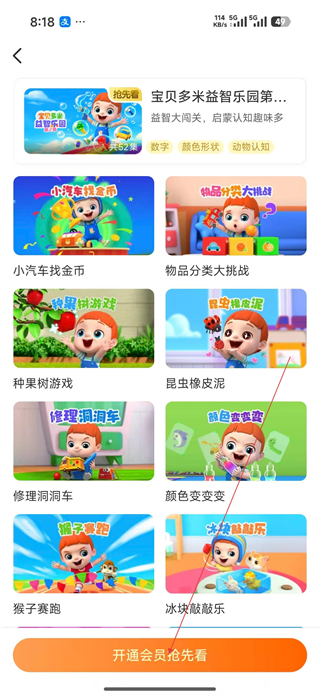 2、在視頻專輯頁面選擇寶貝多米益智樂園對應的視頻,點擊進入該視頻的內容列表頁面,查看包含的各類互動游戲內容。