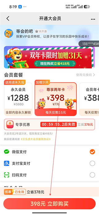4、在開通大會員頁面選擇尊享兩年卡套餐,確認支付方式后,點擊立即購買按鈕,完成支付即可開通會員解鎖對應內容。