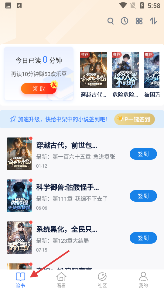 1、追書界面,能看到今日閱讀時長為0,提示再讀10分鐘可賺50歡樂豆,還展示了追讀小說列表。