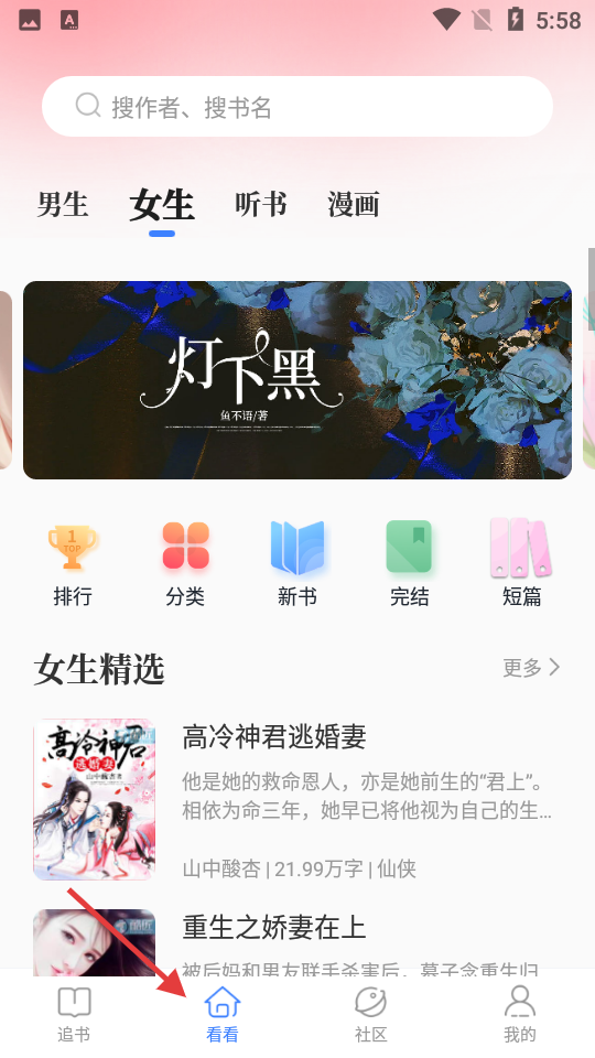 2、看看頁面,提供搜索功能,劃分男女頻道等,有排行、分類選項,還呈現女生精選小說推薦。