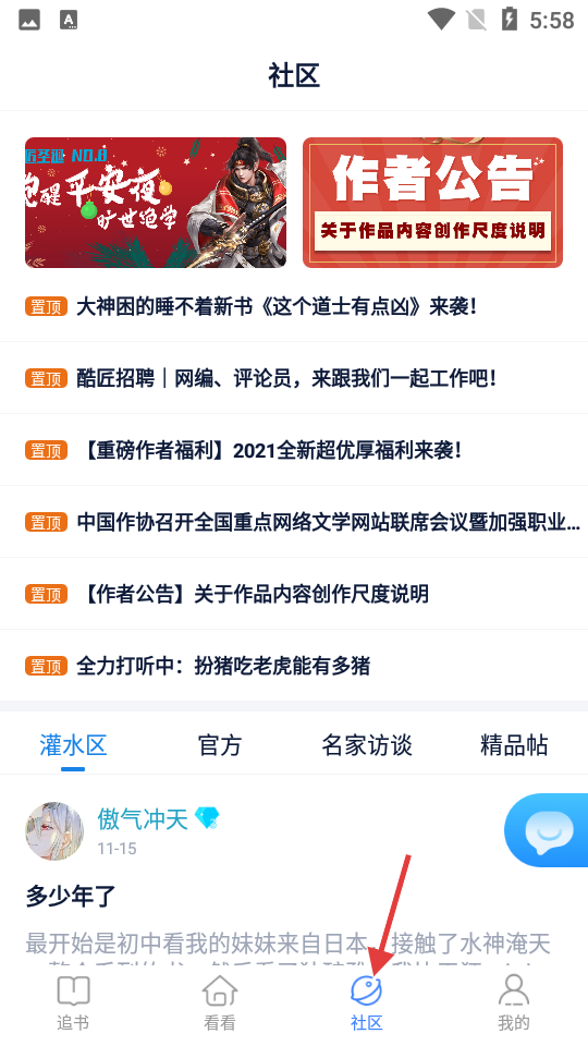 3、社區頁面中,有作者公告等置頂消息,涵蓋灌水區、官方等板塊,方便讀者交流分享及了解行業資訊。