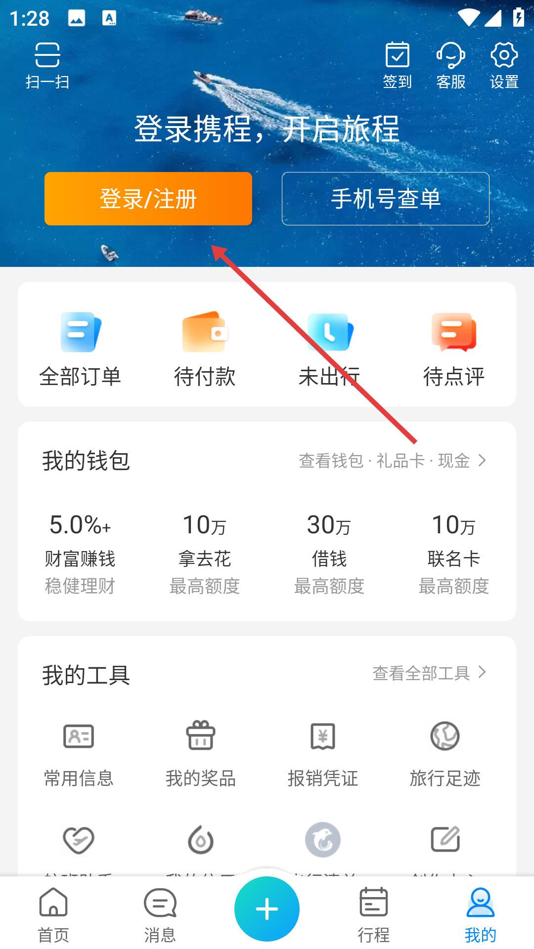 2、攜程旅行我的頁面有掃一掃、簽到等功能,可登錄注冊賬號,還能查看全部訂單、待付款等訂單狀態,以及我的錢包和我的工具等內容。