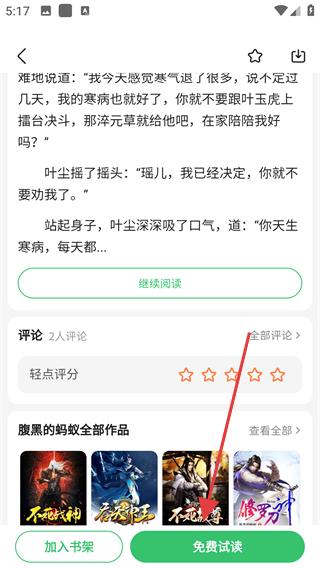 4、在小說詳情頁面,點擊免費試讀按鈕,即可開始閱讀小說,后續可將小說加入書架,繼續閱讀或參與評論,提升閱讀體驗。