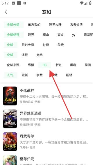3、在篩選頁面,選擇來源如3G,篩選出符合條件的玄幻小說,點擊進入小說詳情頁面。